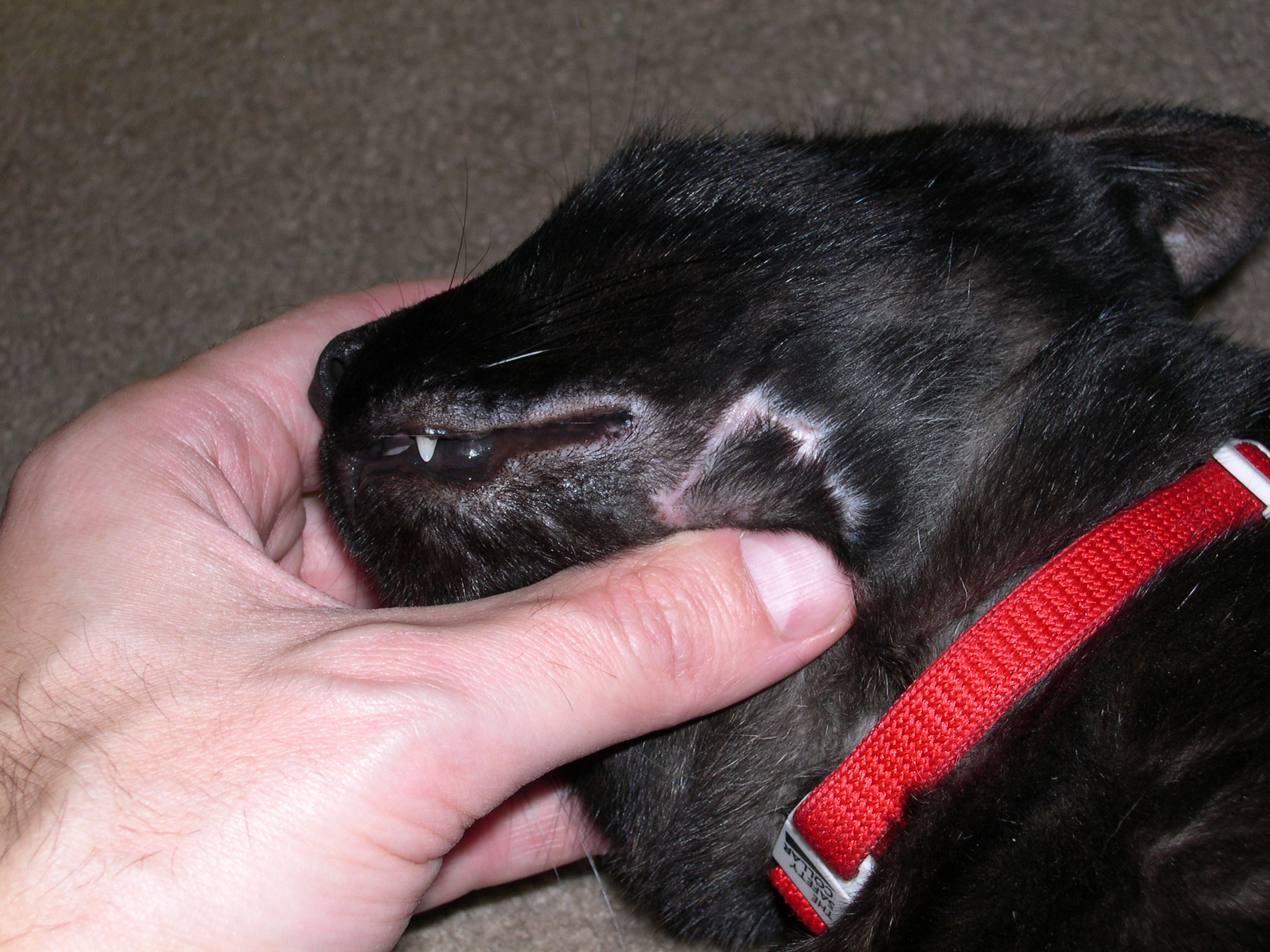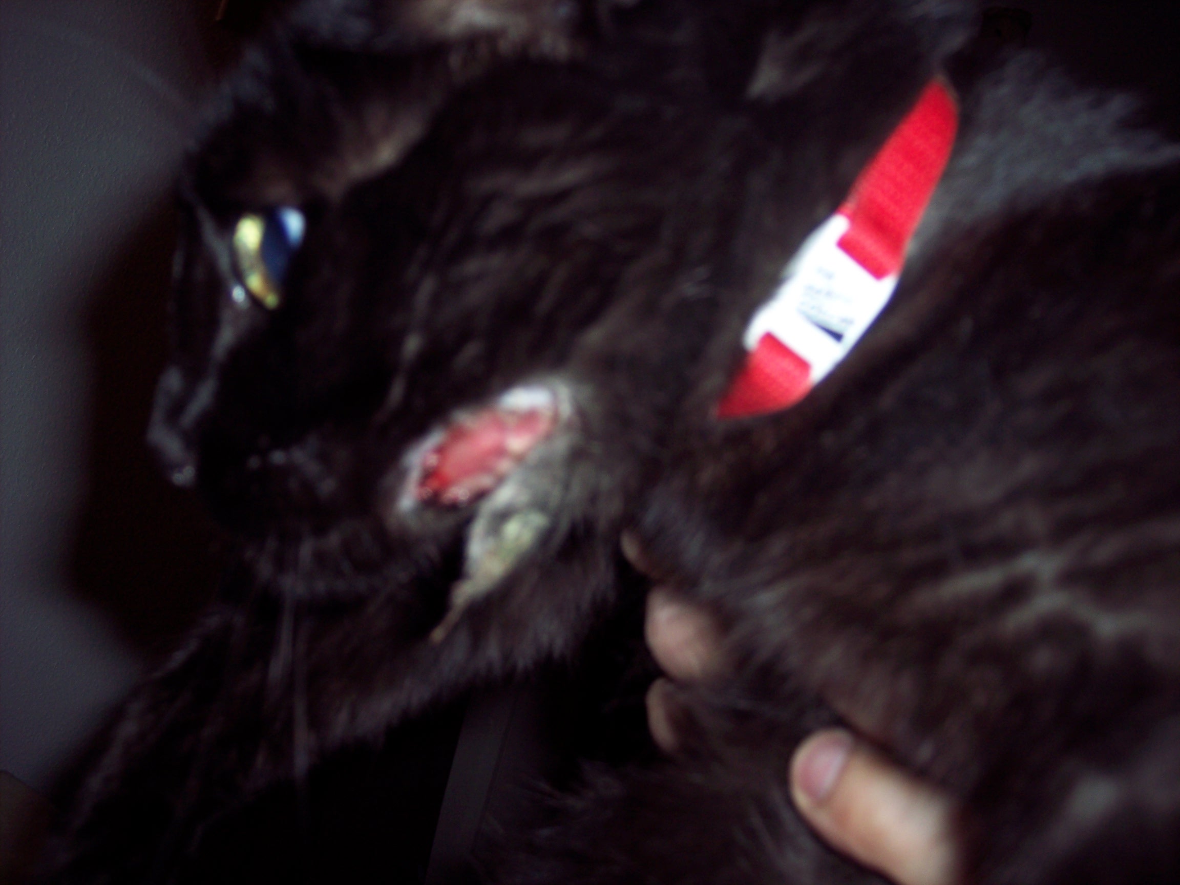 The skin ulcer started with a small hole of only half of a centimeter and reached 2 centimeters on the second day (as seen on the pictures above), pouring a lot of liquid. (The green part that you see on the picture is the clay sticked on the hair). I was filling up the hole with dry ultra-ventilated clay, up to 10 times a day. The clay was absorbed very quickly. The process of filling up was pain free and didn't bother my cat. | |